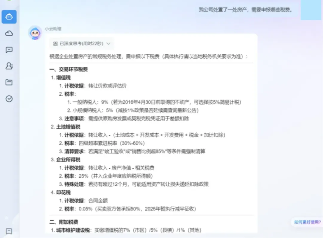 财务知识秒响应:用云之家之前,财务人员日常需处理大量会计准则解读、报销流程咨询等重复性问题,依赖人工查询资料或咨询专家,公文校对、数据分析耗时久,知识无法高效复用,制约团队从 “基础核算” 向 “价值创造” 转型。用云之家之后,员工在云之家中通过对话咨询财务问题,如“企业处置房产需申报哪些税费”,小云 AI 可在 22 秒内输出详尽答案(含增值税、土地增值税等计算依据与税率),替代传统“查资料 + 问专家”模式,知识响应效率提升。